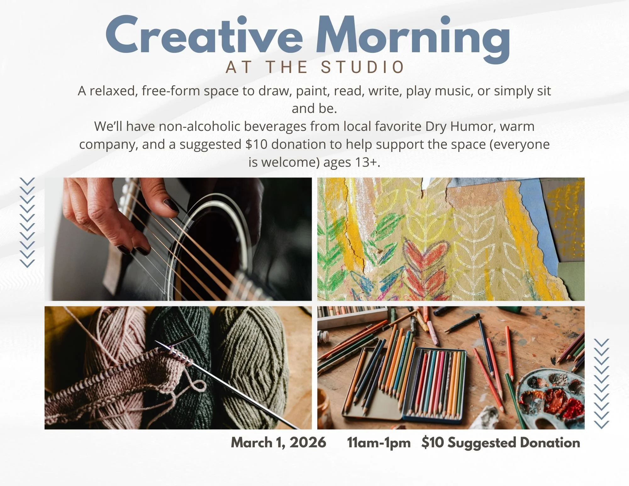 We’ll have non-alcoholic beverages from Dry Humor, warm company, and a suggested $10 donation to help support the space (everyone is welcome) for ages13+.